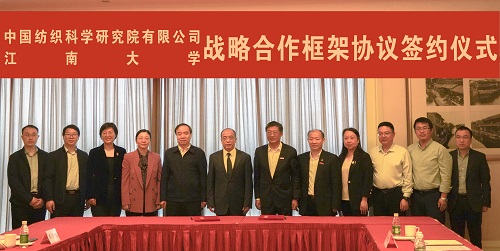 陳衛與姜俊華分別(bie)代表江南大(da)學和中紡(fang)院簽訂(ding)“全面戰略合(he)作框架協議”,雙方(fang)參會(hui)單位代表十余(yu)人(ren)共同(tong)合(he)影(ying)留(liu)念。